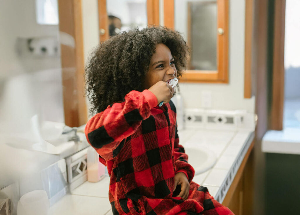 Following updated American Dental Association guidelines, we recommend using a tiny smear of fluoride toothpaste (no larger than a grain of rice) as soon as your child’s first tooth appears. You can brush twice daily with this small amount without waiting until your child is older. After age three, or when your child can reliably spit out toothpaste, you can increase to a pea-sized amount. At White Oaks Kids Dental, we recommend parents continue helping with brushing until around age seven or eight, when most children develop the dexterity and responsibility to brush effectively on their own.